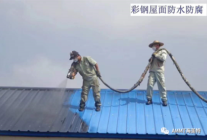 高性能聚脲防水材料在彩鋼瓦防水中應用,涂層致密、無接縫、抗滲透,即使受到外界的熱脹冷縮,涂膜也不會開裂,而且還能將彩鋼瓦整體“裹住”,起到防水作用,能有效阻止屋面老化生銹。即使彩鋼瓦銹透,噴涂聚脲后,仍能起到很好整體防水作用,從而使彩鋼瓦的使用壽命延長10年以上。綜合計算二次維修費用低,避免更換屋面板停工停產造成的損失,同時減少屋面板更換導致的建筑垃圾處理,是目前市場上性能極其優良、品質極其穩定的屋面防水材料。